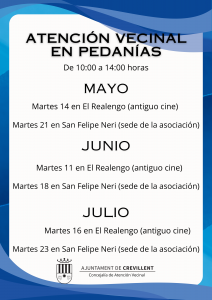 El regidor Francisco Verdú ha explicat que totes les atencions seran en horari de 10.00 a 14.00 hores. Així el pròxim 14 de maig es desplaçarà a la pedania de El Realengo a les dependències de l’antic cinema. El 21 de maig l’edil estarà disponible a San Felipe Neri en la seu de l’associació de veïns. El mes de juny, Verdú Ros acudirà el dia 11 a El Realengo i el dia 18 San Felipe Neri; el mes de juliol, l’edil atendrà el dia 16 en la pedania de El Realengo i el dia 23 a San Felipe Neri.