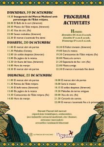 L’horari de l’esdeveniment serà divendres 19 de setembre de 18.00 a 22.30 hores, el dissabte 20 de setembre d’11.00 a 22.30 hores i el diumenge 21 de setembre d’11.00 a 22.00 hores. Pots consultar totes les activitats a través de les xarxes socials de l’Ajuntament.